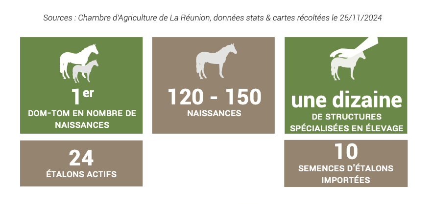 L'élevage est une filière toute jeune à La Réunion qui se structure et se professionnalise depuis quelques années. Les exploitations agricoles équines réunionnaises se distinguent par leur polyvalence. Chaque structure cumule plusieurs activités par nécessité de diversifier ses sources de revenus afin d'assurer la viabilité économique de son activité dans un contexte insulaire exigeant. C'est-à-dire que toutes les structures font quelques naissances pour assurer leur renouvellement de cavalerie, et à l'inverse, une dizaine de structures sont spécialisées en élevage, tout en cumulant d'autres activités telles que de la pension ou des cours d'équitation. Si ce fonctionnement n'est pas propre à La Réunion, il y est davantage marqué que dans d'autres régions !
